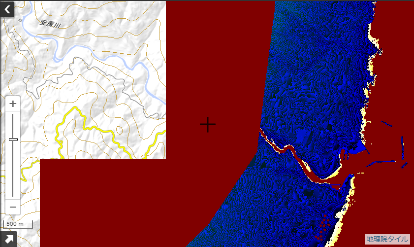例えば、航空レーザ測量による標高データをタイル化する場合、測量区域外、海上、河川、湖沼などは無効値となります。下図の数値PNGタイルで赤色の部分が無効値として扱われている部分です。
