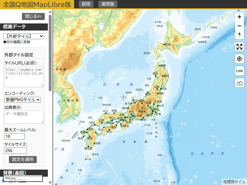 全国Q地図MapLibre版では、任意の標高タイルを読み込んで、可視化することが可能ですので、作成したタイルの確認に利用できます。