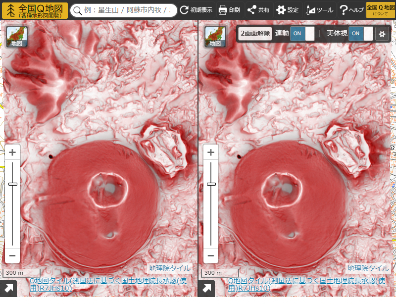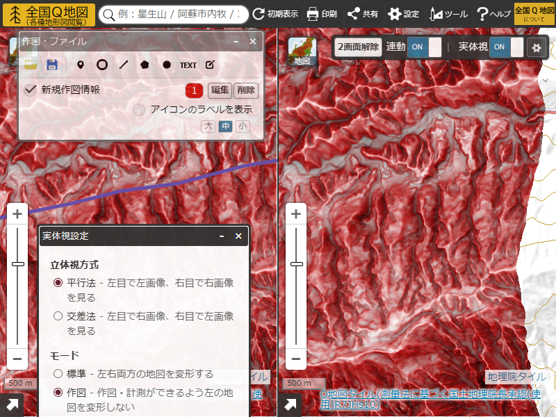 例えば、左右両方に「基盤地図情報(標高)1mメッシュ(DEM1A)のMPI赤色立体地図」を表示します。