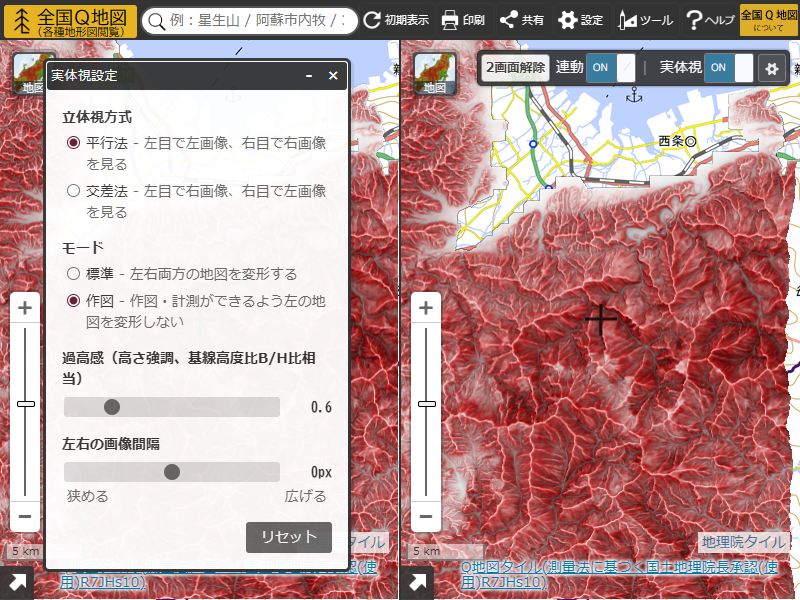 2026年1月17日、全国Q地図に「実体視機能」を追加しました。標高タイルを用いて地形表現図(赤色立体地図、MPI赤色立体地図、CS立体図など)のステレオペア画像をリアルタイムに生成し、平行法又は交差法による実体視(立体視)を可能にする機能です。