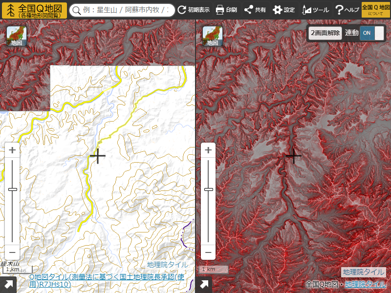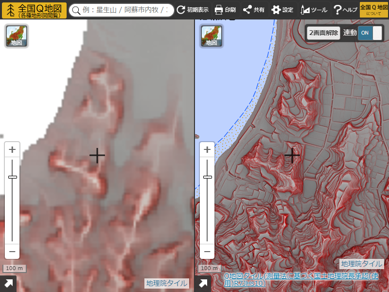 地理院地図で閲覧できる赤色立体地図は、DEM10B(地形図の等高線)を使ったものです(下図の左側)。全国Q地図では、航空レーザによる詳細な標高データを使った赤色立体地図が閲覧可能です(下図の右側)。