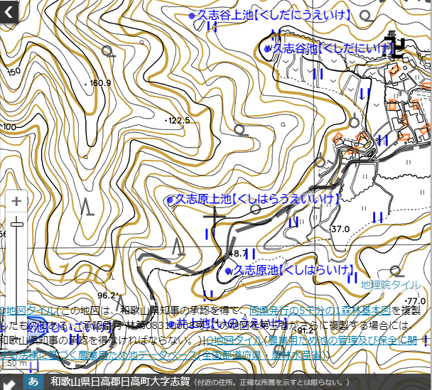 1:2,500の精度で整備されている区域では、おおむね5m平方以上の池が表示されていますので、ほぼ全ての農業用ため池が表示されていることになります。