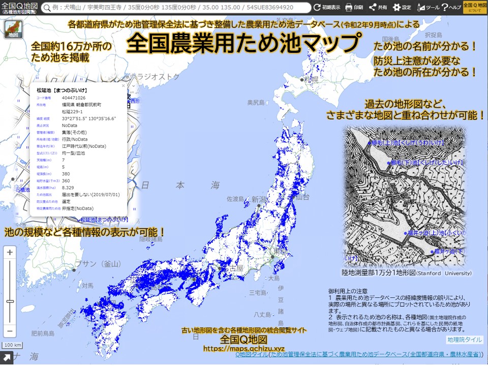 日本全国の農業用ため池の名称、読み、所在地、管理者区分、総貯水量など、各種情報が閲覧できる地図です。2020年11月29日に全国Q地図のコンテンツとして公開を開始しました。おそらく日本で一番多く池の名称が記載された地図です。