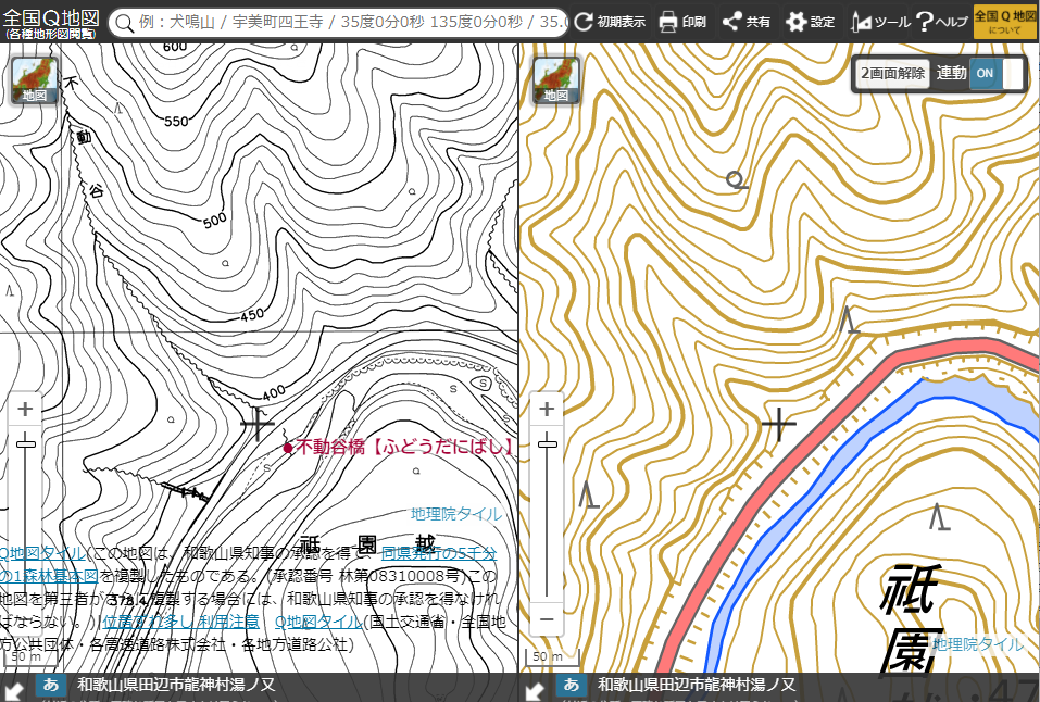 国土地理院の地形図には谷の名前が書かれていないが、橋の名前から、谷の名前が分かる!(和歌山県森林基本図に記載されている谷の名前と一致している。)