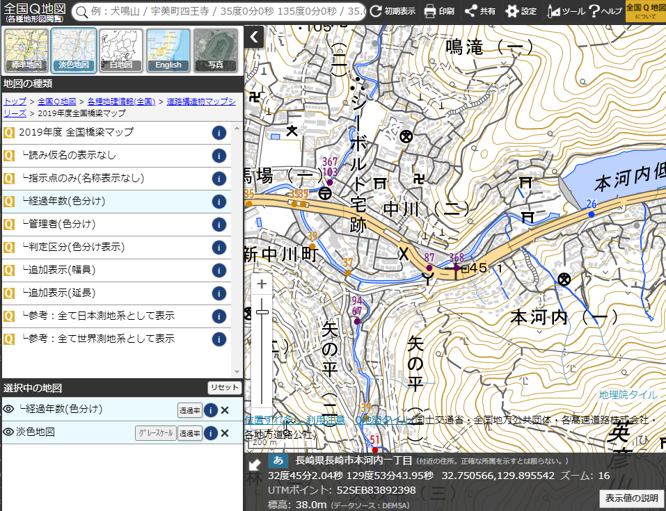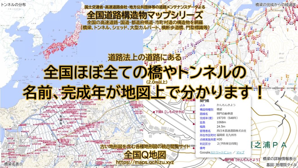 全国の道路法上の道路にある6種類の構造物「橋梁」「トンネル」「シェッド」「大型カルバート」「横断歩道橋」「門型標識等」の名称、完成年度、延長などの各種情報が閲覧できる地図で、日本で一番多くこれらの構造物が記載された地図です。