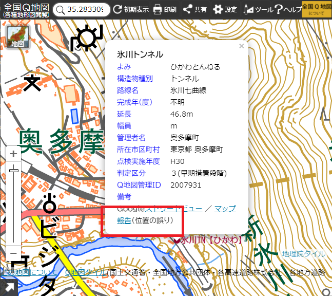簡易なエラーチェックと目視点検により全国Q地図管理者において可能な限り修正を実施していますが、まだ誤りが残っていると思われます。誤ってプロットされているトンネルにお気付きの際は、是非、ポップアップ画面下部の「報告(位置の誤り)」をクリックして、Googleフォームから御報告をお願いします。→2024.07.13 報告受付を終了しました。ありがとうございました。